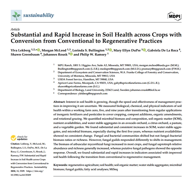 本文研究了从传统农业实践转变为再生农业实践后,不同作物的土壤健康状况在短短九年内显著且迅速地提升,特别是在微生物生物量、土壤有机质和水稳性团聚体方面,表明再生农业实践对土壤健康的积极影响。