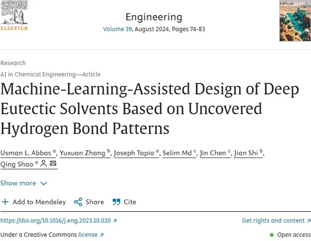 Usman L. Abbas, Yuxuan Zhang, Joseph Tapia, Selim Md, Jin Chen, Jian Shi, Qing Shao. Machine-Learning-Assisted Design of Deep Eutectic Solvents Based on Uncovered Hydrogen Bond Patterns. Engineering, 2024, 39(8): 74–83