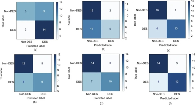 图2 验证期间表现最佳的模型的混淆矩阵。(a)、(b)HB寿命特征:(a)XGBoost随机森林;(b)逻辑回归。(c)、(d)HB数特征:(c)支持向量机;(d)极端随机树。(e)、(f)组合HB数和寿命特征:(e)极端随机树;(f)逻辑回归。右侧的颜色条表示模型的性能,从白色到蓝色表示性能从差到好。