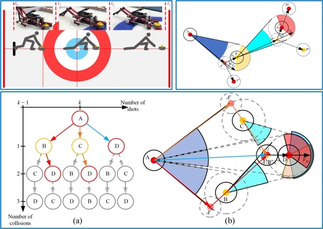 在冰壶比赛中,运动员常通过击打冰壶改变冰壶位置影响比赛。研究引入击打域和击打树概念对潜在碰撞进行数学分析和描述。击打域由碰撞域和速度可能域构成。其中,碰撞域由从冰壶A中心出发、与以冰壶B中心为圆心、两倍冰壶半径为半径的圆相切的两条切线组成,当冰壶A速度方向在碰撞域内时,可根据碰撞模型得到冰壶B的速度可能域。对于冰面上多个冰壶,通过组合、排列和剪枝等操作生成击打树,当某分枝击打域为空时进行剪枝,从而分析和描述潜在的投掷策略,为机器人决策和控制参数求解提供基础。