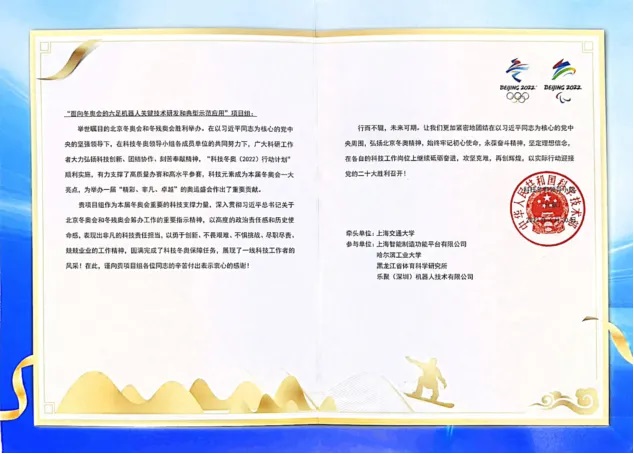 目前团队在六足机器人的研发方面在国际上处于领先,其特色在于机构本体创新发明的服务能力,在机器人基础部件研发和人机交互智能化控制方面有较强实力。团队坚持自主开发核心控制算法与核心部件,已经形成机器人核心驱动单元部件,包括:六维力/力矩传感器、扭矩传感器以及一体化柔性集成驱动单元。2022年团队获得“科技冬奥”重点专项“面向冬奥会的六足机器人关键技术研发和典型示范应用”项目以及“冰雪面火炬传递六足机器人开发”项目。开发出冰壶、滑雪、导盲等5款六足机器人,其中冰壶机器人在2022北京冬奥会现场进行的展示,取得了6次击打全面命中的成绩;滑雪六足机器人入选了2022年“奋进新时代主题成就展”,作为北京冬奥科技创新成果的展示。