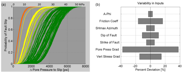 研究采用斯坦福大学诱发与触发地震中心开发的FSP v.2.0软件进行断层滑移潜力分析,这是该工具首次应用于海洋环境。通过确定性分析发现,在静水应力场下,大多数断层不易滑移,仅部分断层需要200-1200 psi(1.38-8.27 MPa)的孔隙压力增加才会引发滑移。概率分析采用1000次蒙特卡洛模拟,考虑了垂直应力梯度、孔隙压力梯度、断层走向/倾角、摩擦系数和最大水平应力方向等参数的不确定性。结果显示,对于非临界应力状态断层,孔隙压力变化需超过3000 psi(~21 MPa)时失效概率才达到80%。针对拟议的CO2注入方案(2.5百万吨/年,持续10年),研究建立了水文模型,考虑玄武岩含水层厚度(100m和300m)、孔隙度(10%)和渗透率(0.322D)等参数。模拟显示,由于玄武岩含水层厚度大、渗透性好,注入引起的孔隙压力增加仅为10-30 psi(0.07-0.21 MPa),远低于引发断层滑移的阈值压力。