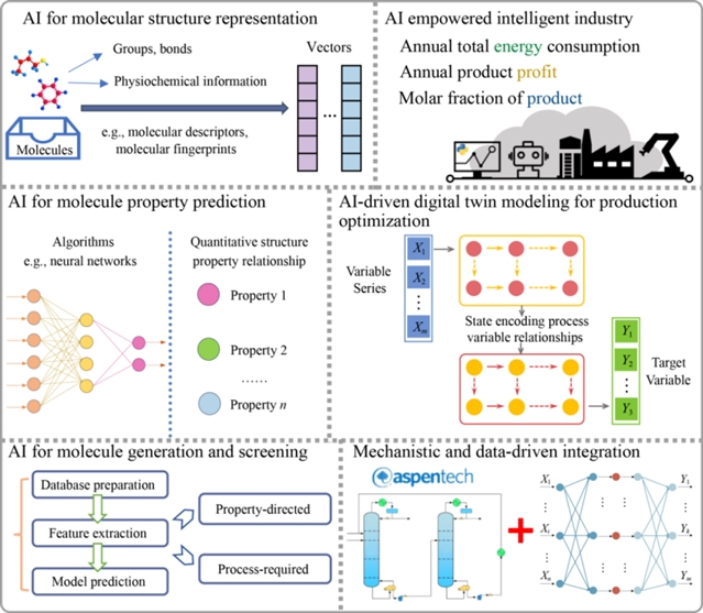 随着第四次科技革命的到来,新一代人工智能(AI)为化学工程领域的动量、热量、质量传递以及化学反应过程建模赋予了新的内涵与机遇。人工智能技术在化工行业的应用日益广泛且不断发展,为解决实际难题提供了更有效的方案。本文综述了化工行业从传统数字模拟向先进人工智能方法的转型,聚焦于从分子到工厂全尺度下的高效、低碳目标,重点介绍了申威峰研究团队开展的相关工作。在分子层面,分子特征的智能捕获及构效关系的精准测定已趋于成熟。此外,通过基于人工智能的高通量筛选和生成模型,实现了溶剂、反应试剂等物质的多功能驱动反向分子设计。为了提升化工分离过程的安全性、环境友好性以及减碳性能,研究人员提出了一系列创新性强化策略,核心关注溶剂设计的系统优化。在实际生产的过程尺度上,构建的机理模型往往与实际系统行为存在偏差,从而限制了模型的工业应用。为了解决这一问题,研究人员成功开发了机理-数据混合驱动框架,利用人工智能技术增强对实际复杂分离系统的预测、诊断、优化与控制能力。最后,作为连接大数据智能技术与实际工业过程的桥梁,本文探讨了动态数字孪生建模在提升化工行业效率与可持续性方面的应用潜力。