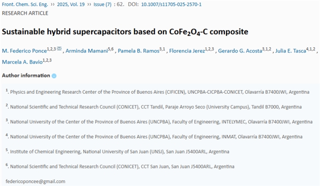 M. Federico Ponce, Arminda Mamani, Pamela B. Ramos, Florencia Jerez, Gerardo G. Acosta, Julia E. Tasca, Marcela A. Bavio. Sustainable hybrid supercapacitors based on CoFe2O4-C composite. Front. Chem. Sci. Eng., 2025, 19(7): 62