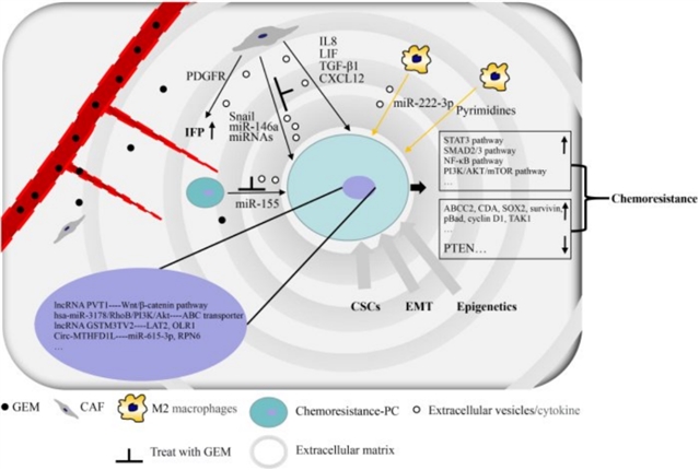化疗耐药机制涉及肿瘤微环境(TME)和肿瘤细胞自身改变。TME中致密的细胞外基质导致组织间液压力升高,阻碍药物渗透,同时缺氧和酸性环境诱导肿瘤代谢重编程;成纤维细胞、巨噬细胞等通过分泌细胞因子、外泌体激活STAT3、PI3K/AKT等通路,促进耐药。肿瘤细胞自身的癌症干细胞(CSC)、EMT及表观遗传修饰也参与耐药,例如,抑制EMT可上调核苷转运体表达,增强吉西他滨(GEM)敏感性(图2)。