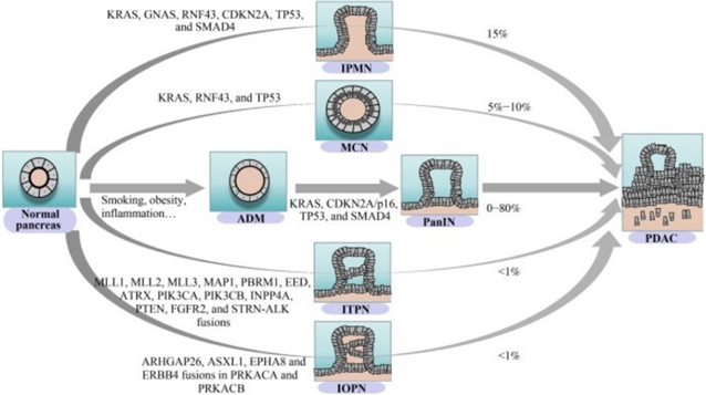 图1 胰腺癌癌前病变的特征及常见突变基因