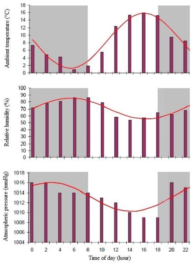 30日龄荷斯坦犊牛在自然条件下进行试验,光照周期为10L:14D,试验期间气候变量的节律模式。