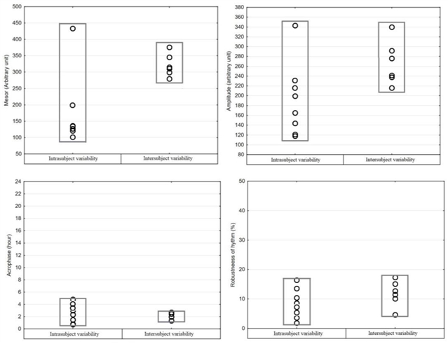 连续六天记录八头小牛的总运动活动节律昼夜节律参数的个体内和个体间变异性的分析结果。