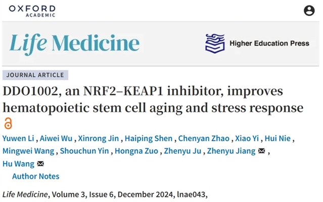 2024年12月,杭州师范大学汪虎课题组与中国药科大学姜正羽课题组合作在Life Medicine杂志在线发表了题为DDO1002, an NRF2–KEAP1 inhibitor, improves haematopoietic stem cell aging and stress response的研究论文,揭示了一种新型有效的NRF2–KEAP1通路抑制剂DDO1002,可以阻断NRF2的降解,上调NRF2蛋白水平,降低ROS产生,激活抗氧化相关通路,从而能够改善造血干细胞衰老以及辐照诱导的造血功能障碍。