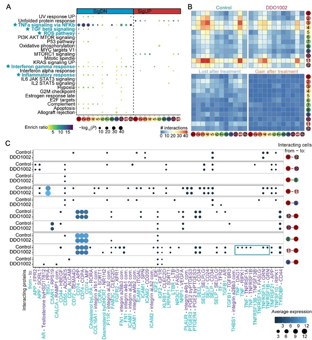 为了进一步探究其潜在机制,研究人员对注射药物的老年小鼠以及对照的混合骨髓细胞进行了单细胞测序分析。结果揭示了DDO1002处理可减弱衰老HSC细胞内炎症信号通路和ROS通路,表明其具有恢复HSCs活力的潜力。研究人员进一步分析了免疫细胞和HSC之间的相互作用基因对,发现HSCs和单核/巨噬细胞之间丢失了一些涉及TNF或其受体的相互作用,这再次表明药物处理后TNF信号通路活性降低以及免疫微环境改善。