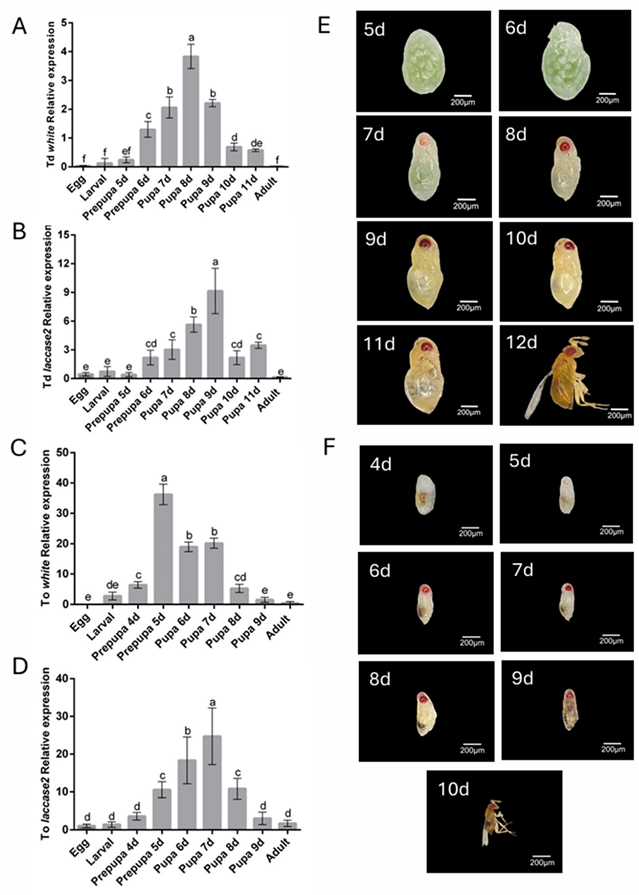 图1. white基因和laccase 2基因在松毛虫赤眼蜂T. dendrolimi (Td) 和玉米螟赤眼蜂T. ostriniae (To) 中的空间表达模式图谱和发育时间图谱。