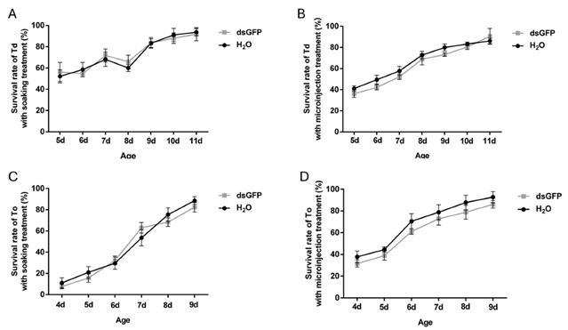 图2.浸泡和显微注射处理对松毛虫赤眼蜂T. dendrolimi (Td) 和玉米螟赤眼蜂T. ostriniae (To) 存活率的影响。