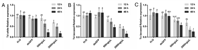 图3.在不同的dsRNA浸泡时间下,RNAi介导的松毛虫赤眼蜂T. dendrolimi (Td) 和玉米螟赤眼蜂T. ostriniae (To) 中white和laccase 2基因的沉默效率。