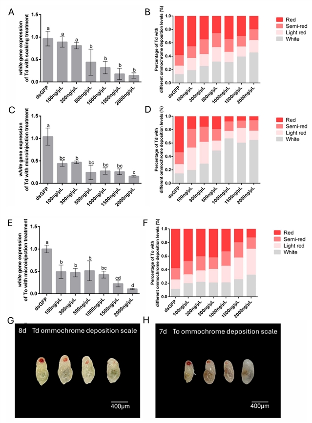 white基因:T. dendrolimi浸泡法在2000 ng/μL达到85.61%转录抑制,显微注射在2000 ng/μL达84.29%。T. ostriniae (显微注射) 在2000 ng/μL达到89.36%抑制。表型上,高浓度处理导致显著比例的白眼蛹 (T. dendrolimi浸泡45.07%,显微注射64.06%;T. ostriniae显微注射32.09%)。