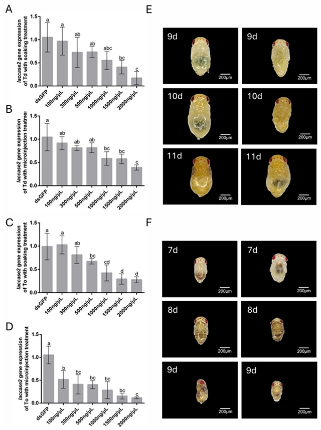 laccase 2基因:T. dendrolimi浸泡法在2000 ng/μL达到88.35%抑制,显微注射在2000 ng/μL为60.99%。T. ostriniae浸泡法在2000 ng/μL达73.31%抑制,显微注射在2000 ng/μL达89.36%。表型上,基因沉默导致表皮硬化不完全,虫体软化畸形 (图5E、F)。值得注意的是:在1000~2000 ng/μL浓度下,浸泡法可以达到与显微注射相当的沉默效率 (尤其在耐受性好的阶段和物种)。低浓度 (如100 ng/μL) 显微注射也能在T. ostriniae中达到约50%的white和laccase 2沉默效率,表明微小膜翅目寄生蜂对dsRNA具有较高的生物可利用度,但存在潜在的RNAi机制饱和阈值。