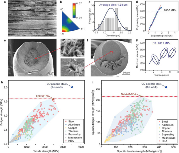 基于上述原则,研究选择传统金属材料中具有最高弹性模量的钢,并具体到组织极细且稳定的珠光体钢,来探讨疲劳强度理论上限。研究通过冷拔工艺,消除弱取向片层,形成织构,提升组织强度均匀性。研究通过固溶强化、加工硬化和晶界强化协同作用,实现2850 MPa超高弹性极限和3525 MPa超高抗拉强度。上述高强均匀组织,可抑制滑移带应变局部化导致的疲劳开裂,获得超高理论疲劳强度。研究通过超纯净冶炼和后续多道次拉拔,实现珠光体钢丝夹杂物平均尺寸仅1.38 μm,降低应力集中。在现有冶炼水平下,夹杂物不可避免,因此通过优化拉拔工艺,使钢丝在具有超高强度的同时仍保留一定应变硬化能力,从而降低夹杂物周围组织应力集中程度。在强织构的纳米片层组织冷拔珠光体钢丝中,研究提高了拉-拉疲劳强度及拉-拉比疲劳强度世界纪录。