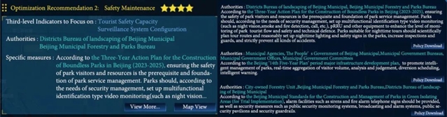 最后,将指标-政策-事权知识图谱与公园的相对劣势指标进行匹配,以链接相关的政策条文和实体责任单位,并结合文本生成技术形成具体文字性建议。