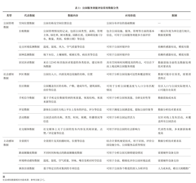 为了尽可能全面涵盖公园服务效能感知数据,本文对目前常用的评估数据进行了分类。多源数据的引入和组合使用可为公园服务效能挖掘提供充分支持。