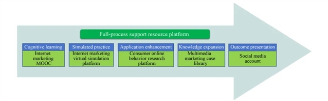 “四位一体”教学资源系统包含全流程支持资源、沉浸式教学系统、自主学习环境和综合实验平台。全流程支持资源覆盖认知学习到成果展示的五个阶段,如认知学习阶段利用在线资源辅助学习。沉浸式教学系统借助移动互联网营销云平台,利用大数据和虚拟仿真技术提供真实市场场景和操作体验。自主学习环境支持移动学习,整合设备、数据和场景设计,助力学生将理论转化为解决问题的技能。综合实验平台融入真实行业案例和大数据洞察,让学生体验完整营销价值链。