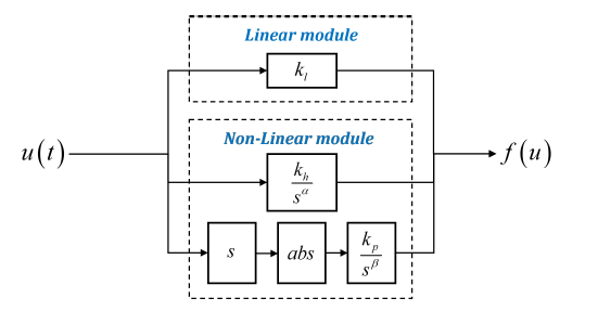的分数阶耦合模型,仅通过 6 个参数实现滞后与蠕变特性的精准描述。通过分数阶迟滞模型的结构图(如下),清晰展示线性与非线性模块的叠加关系。
