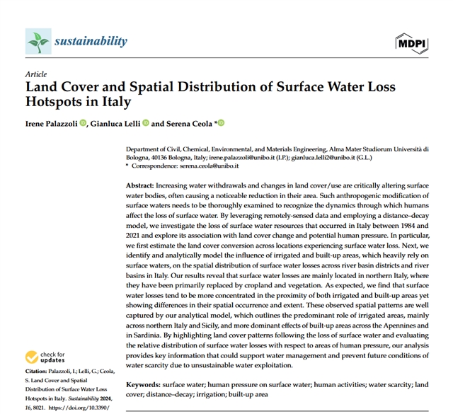 本文研究了1984年至2021年间意大利地表水损失的热点区域及其与土地覆盖变化和人类活动的潜在关联,发现地表水损失主要集中在意大利北部,且与灌溉和建设区域密切相关。