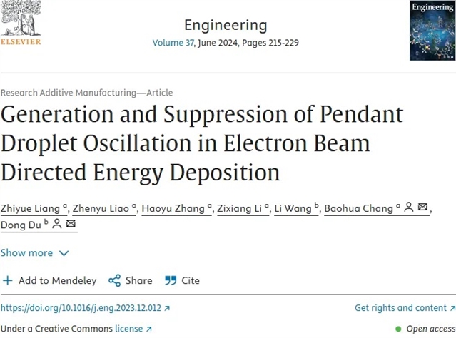 Zhiyue Liang, Zhenyu Liao, Haoyu Zhang, Zixiang Li, Li Wang, Baohua Chang, Dong Du. Generation and Suppression of Pendant Droplet Oscillation in Electron Beam Directed Energy Deposition. Engineering, 2024, 37(6): 231–246