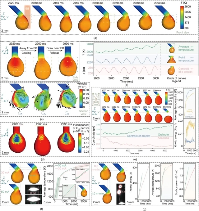 图2 熔滴振荡的起因分析。(a)在一个熔滴振荡周期的熔滴温度场;(b)熔滴形心横坐标、空间中一点的温度以及熔滴平均温度的时域变化曲线;(c)熔滴振荡过程中,熔滴纵截面内的流体流动方向及速度的典型结果;(d)金属蒸气反冲压力在Y轴方向上的单位体积分力在振荡过程中的典型结果;(e)在仿真模型中去掉金属蒸气反冲压力后的熔滴形心变化曲线、熔滴温度示例,以及金属蒸气反冲压力存在与否对熔滴平均温度和动能的影响;(a)~(e)的数据的基础工艺参数均为加速电压60 kV、束流30 mA及送丝速度0.5 m/min;(f)束流为30 mA和50 mA的仿真结果对比;(g)送丝速度为0.5 m/min和1.0 m/min的仿真结果对比。