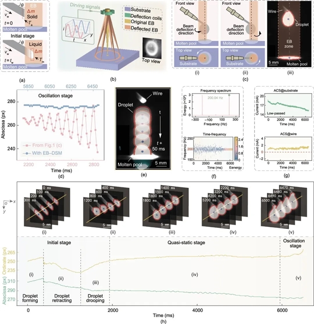因此,研究团队尝试揭示电子束熔丝增材制造过程中的熔滴形成和振荡的典型行为及影响因素。研究团队充分利用了成形过程产生的光学和吸收电流信息,对熔滴长大及振荡过程开展了融合监测,展示了熔滴振荡现象的基本特征、后果及影响因素。