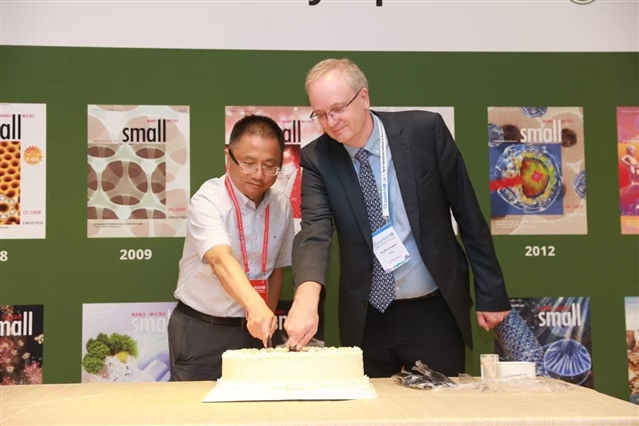 为庆祝Small创刊20周年,会议首先播放了一条来自全球多位高贡献作者的祝福短片——他们以视频、照片、文字等多种形式向Small致以诚挚的祝福。随后, Small期刊主编Neville Compton博士与国家纳米科学中心主任唐智勇院士共同切开20周年主题蛋糕并合影留念,为这一里程碑时刻定格。