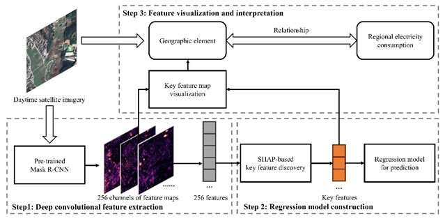 本研究提出了一个三阶段的“可解释回归”(XRegression)框架:(1)特征提取:利用深度学习模型 Mask R-CNN 与特征金字塔网络(FPN)提取高分辨率图像中的多尺度空间特征。(2)特征筛选:使用随机森林回归结合 SHAP 模型,识别对用电预测影响最大的关键图像特征。(3)特征可视化解释:通过特征图激活分析,结合乡村地理知识,揭示图像中“新建农房”“道路通达性”“农田林地”等地理要素与用电水平之间的关系。该方法以广东省新兴县547个500m×500m栅格为样本单元,模型预测精度达到 0.797 的相关系数水平,显著优于传统方法。
