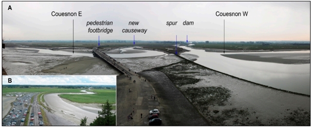 图3.从圣米歇尔山城墙拍摄的照片(南向)。(A)2023年2月21日。(B)2007年5月31日。请注意,视角略有不同。2007年,汽车停在离圣米歇尔山很近的地方。背景中,卡塞恩大坝的拆除工作已经开始(可见一台建筑起重机)。库埃农河在堤道中蜿蜒流淌,仅位于堤道西侧。新的设施将于2023年将库埃斯农河分成不同的部分(库埃斯农河东西两段,以及沿支脉的河道)。目前,该河道已被部分侵蚀。