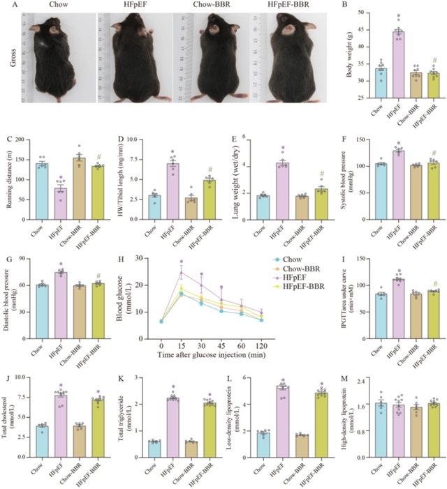 研究团队采用“双打击”小鼠模型模拟人类射血分数保留型心力衰竭的病理生理过程:给予成年雄性C57BL/6N小鼠高脂饮食联合一氧化氮合酶抑制剂L-NAME处理15周,随后每日灌胃给予小檗碱(50mg/kg)治疗4周。通过超声心动图检测发现,射血分数保留型心力衰竭模型小鼠出现左心室质量增加、室间隔和后壁舒张期厚度增厚,同时伴有舒张功能指标异常,表现为E波速度升高、e波速度降低、E/A比值和E/e比值升高(图1)。而小檗碱治疗显著逆转了这些舒张功能指标的异常,但对射血分数、短轴缩短率等收缩功能指标无明显影响,提示小檗碱对射血分数保留型心力衰竭的改善作用主要针对舒张功能障碍。