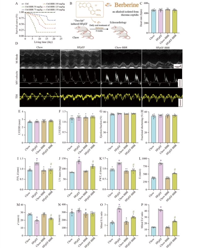 复旦大学附属中山医院任骏、张英梅、葛均波,同济大学附属上海市第十人民医院彭沪等的一项研究表明,小檗碱可通过抑制Drp1介导的线粒体分裂和调节钙稳态,改善射血分数保留型心力衰竭小鼠的心肌舒张功能,为射血分数保留型心力衰竭的治疗提供了新的靶点和潜在药物。