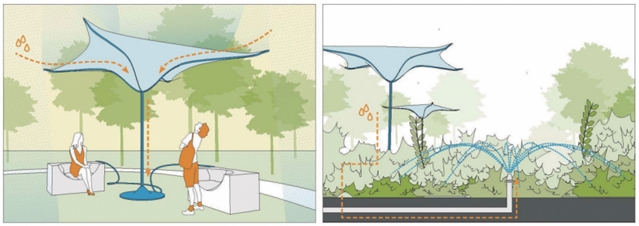 环境治理场景:海绵城市与雨水花园示意图。利用数字系统和感知设备增强对雨水的监测,可促进场地的雨水吸纳、蓄渗、回收利用能力 © Rui Guan, Vanke 2049 Future City Laboratory