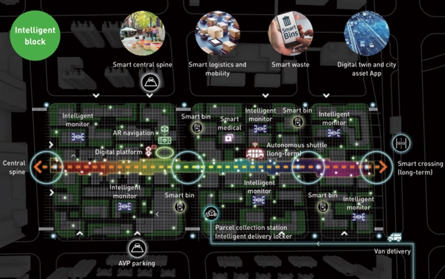 智能场景总体展示图。通过对接城市运营系统,该智慧街道项目实现了智慧物流、生活服务、数字孪生等运营场景 © Foster + Partners & Vanke 2049 Future City Laboratory