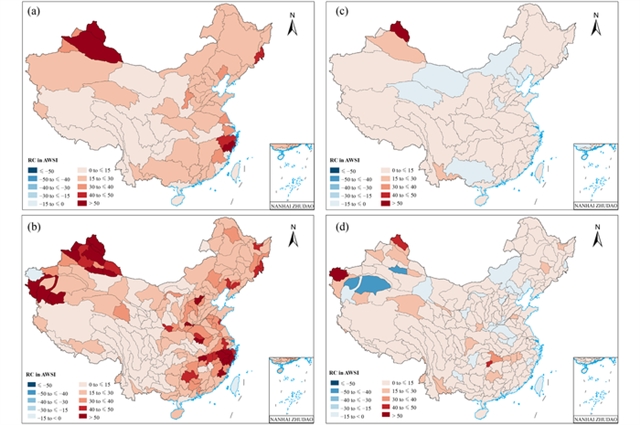 图6 干旱和高温条件下二级流域 (a, c) 和三级流域 (b, d) 的AWSI的相对变化 (审图号:GS京 (2024) 1698号)。