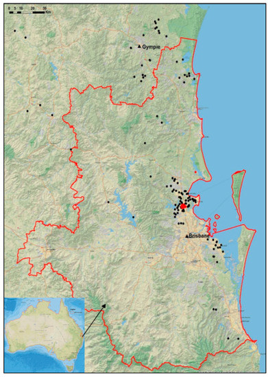 昆士兰州东南部地图(SEQ;红线)显示了澳大利亚动物园野生动物医院收治的考拉的来源地(黑色圆圈),以及88只The Mill考拉的所在地(红色圆圈)。插入的地图显示了澳大利亚昆士兰州东南部的位置。