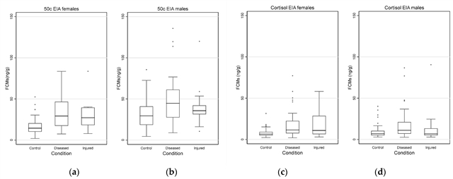 箱线图显示了对照组(雌性 N = 63;雄性 N = 61)、患病组(雌性 N = 42;雄性 N = 34)和受伤组(雌性 N = 11;雄性 N = 19)雌性和雄性考拉的 FCM(粪便皮质醇代谢物)值(ng/g),在第一天采集时使用 50c(a、b)和皮质醇(c、d)EIA(酶联免疫吸附测定)进行测量。