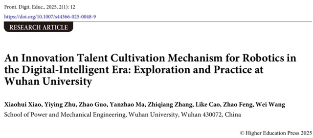 武汉大学肖晓晖教授等在Frontiers of Digital Education(《数字教育前沿(英文)》)期刊上发表了一篇题为An Innovation Talent Cultivation Mechanism for Robotics in the Digital-Intelligent Era: Exploration and Practice at Wuhan University(《数智时代的机器人创新人才培养机制——武汉大学的探索与实践》)的文章,聚焦数字智能时代机器人创新人才培养机制展开深入探究,以武汉大学相关实践为样本,提出了兼具创新性与可操作性的培养框架。