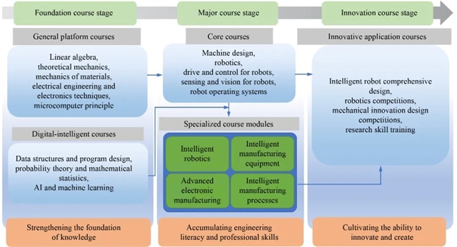 文章首先剖析了机器人人才培养的特点与挑战。机器人领域涉及机械工程、电子、计算机科学等多学科交叉,且知识体系具有前沿性与创新性。但传统教学存在理论与实践脱节、课程体系碎片化等问题,难以培养学生解决复杂工程问题的能力。针对这些痛点,武汉大学提出了三阶段递进式实践课程体系。基础课程阶段,除传统数理、电子课程外,增设数据结构、人工智能等数字智能课程;专业课程阶段,以机器人结构设计、控制等核心课程为重点,融入AI技术,通过仿真与实操强化学生专业技能;创新课程阶段,依托机器人竞赛、科研项目等,采用项目驱动教学法,培养学生创新实践能力。