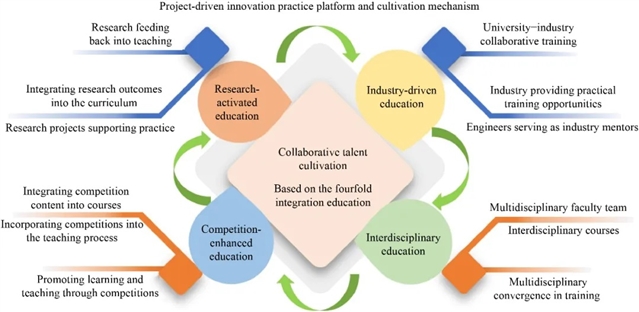 在实践平台搭建方面,文章提出了“四维融合”培养机制,即研教融合、产教融合、赛教融合与跨学科融合。研教融合将科研成果转化为教学内容,引导学生参与实际科研项目;产教融合联合行业龙头企业,为学生提供实践机会;赛教融合将学科竞赛纳入课程体系,以赛促学;跨学科融合组建多学科教学团队,打破学科壁垒。