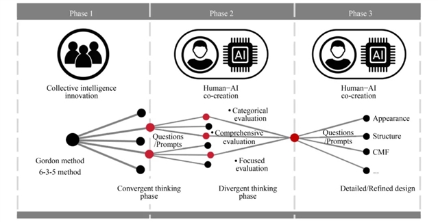 研究采用案例研究、自主学习策略和反思分析,以武汉大学“设计思维与概念设计”课程为实践场景,开展人智共创教学实验。课程面向产品设计专业大三学生,为期32小时,在概念设计实践和设计实施阶段融入人智共创。实验分为三个阶段:集体智慧创新的发散思维阶段、人智共创的发散与收敛思维结合阶段、利用AI图像生成工具加速设计方案形式开发的细化阶段。