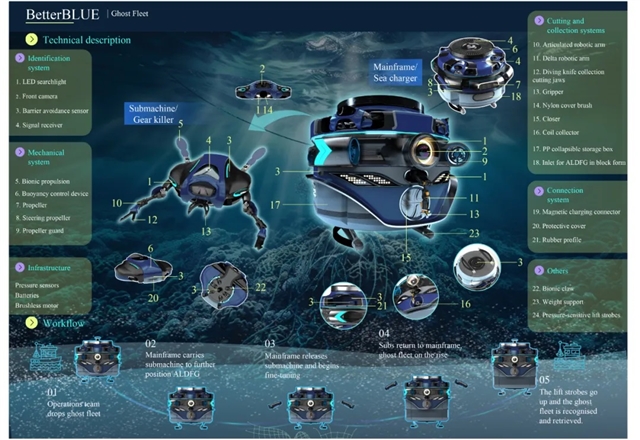 案例研究呈现了两个典型项目。其一,为濒危兰花原位保护机器人系统概念设计,在发散思维阶段,学生通过小组讨论结合AI工具生成并评估设计方案,确定聚焦微观折叠机器人方向,借助AI获取濒危植物数据等,明确机器人用于兰花种子收集和原位保护的目的;在产品形态开发阶段,综合AI建议,利用多工具协作生成视觉图像,最终设计出微昆虫机器人和巢系统。其二,珊瑚礁区幽灵渔具清洁机器人系统设计,从旋转结构出发,通过AI拓展思路,确定针对幽灵渔具问题,设定多项目标,经AI辅助研究,采用母子协作结构,设计出具有流线型主体、灵活机械臂和仿生推进系统的机器人。