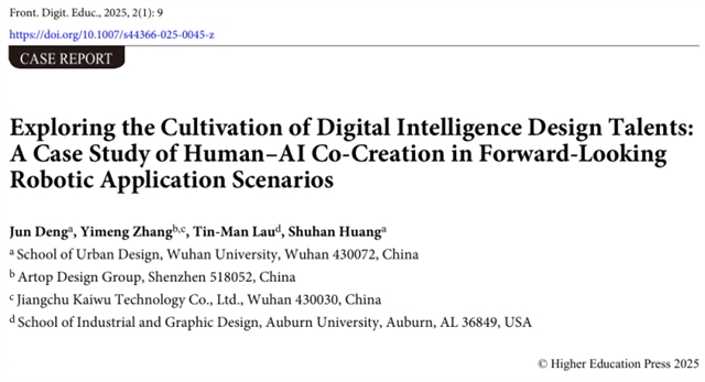基于此,武汉大学邓俊副教授等在Frontiers of Digital Education(《数字教育前沿(英文)》)期刊上发表了一篇题为Exploring the Cultivation of Digital Intelligence Design Talents: A Case Study of Human–AI Co-Creation in Forward-Looking Robotic Application Scenarios (《探索数智设计人才培养——以前瞻机器人应用场景下人智共创为例》)的文章,通过武汉大学课程中两个机器人设计案例,探讨AI在设计教育中的应用,分析其提升效率、激发创意的潜力与局限,为培养数字智能设计人才提供方向。