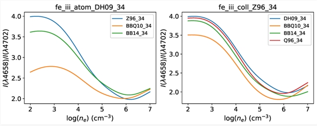 我们采用PyNeb 1.1.16 Python软件包评估适用于[Fe II]和[Fe III]光谱建模的原子数据集,这些数据集包含能级能量、爱因斯坦A系数及有效碰撞强度值。大多数数据集从原始文献重建,并纳入新数据集与观测和测量基准进行比对。对于[Fe III],我们获得了确定性结果,从而能够选定默认数据集;而对于[Fe II],碰撞数据显著的温度依赖性成为主要制约因素——这种依赖性主要源于3d7a4F9/2亚稳态能级的临界密度异常之低,该能级布居强烈依赖于辐射和碰撞数据,尽管恒星连续谱荧光泵浦对该能级布居的影响亦不可排除。新版PyNeb(1.1.17)已发布,内含经评估的数据集。