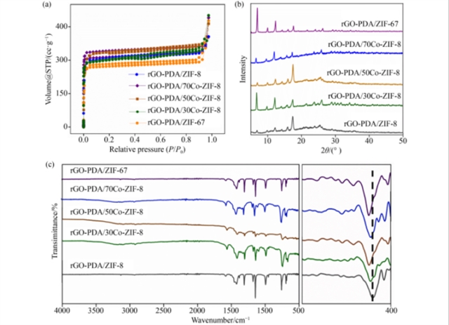 研究通过三步法构建了rGO-PDA/Co-ZIF-8杂化气凝胶:首先通过水热还原法将GO纳米片自组装为3D水凝胶结构,随后利用聚多巴胺(PDA)对其表面进行功能化修饰,引入大量活性位点,最后通过原位结晶技术在气凝胶表面生长钴掺杂ZIF-8纳米晶体。通过调控钴掺杂比例,发现rGO-PDA/50Co-ZIF-8气凝胶表现出900 m2·g–1的高比表面积,并能在水中稳定存在10天以上。