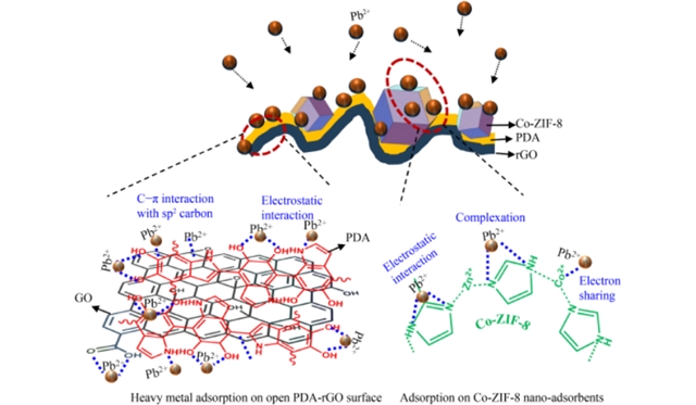 图4 rGO-PDA/50Co-ZIF-8气凝胶对Pb(II)的吸附机制示意图。