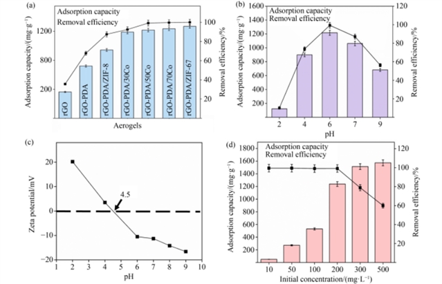 图3 合成气凝胶的重金属吸附性能:(a) 不同类型气凝胶的吸附容量与去除效率,(b) 不同pH环境下的吸附容量与去除效率,(c) 不同pH条件下的zeta电位,(d) 3D rGO-PDA/50-ZIF-8气凝胶在不同初始浓度下的吸附容量与去除效率。