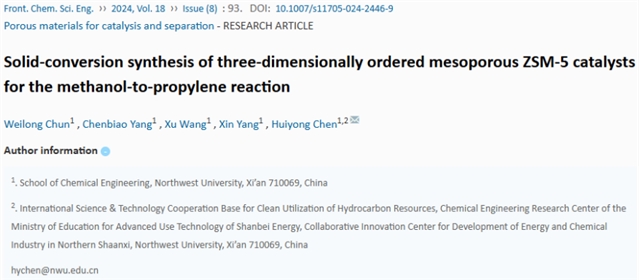 西北大学化学学院陈汇勇教授团队在《Frontiers of Chemical Science and Engineering》发表了题为“Solid-conversion synthesis of three-dimensionally ordered mesoporous ZSM-5 catalysts for the methanol-to-propylene reaction”(三维有序介孔ZSM-5催化剂的固相转化合成及其在甲醇制丙烯反应中的应用)的研究论文,提出了一种基于固体转化法(SC)的简化策略,成功合成了具有三维有序介孔结构的ZSM-5分子筛(3DOm ZSM-5),并系统评估了其在甲醇制丙烯(MTP)反应中的催化性能。