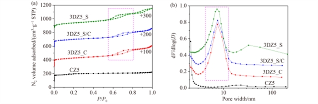 图3 CZ5、3DZ5_C、3DZ5_S/C和3DZ5_S的(a)氮气吸附-脱附等温线及(b)BJH孔径分布。